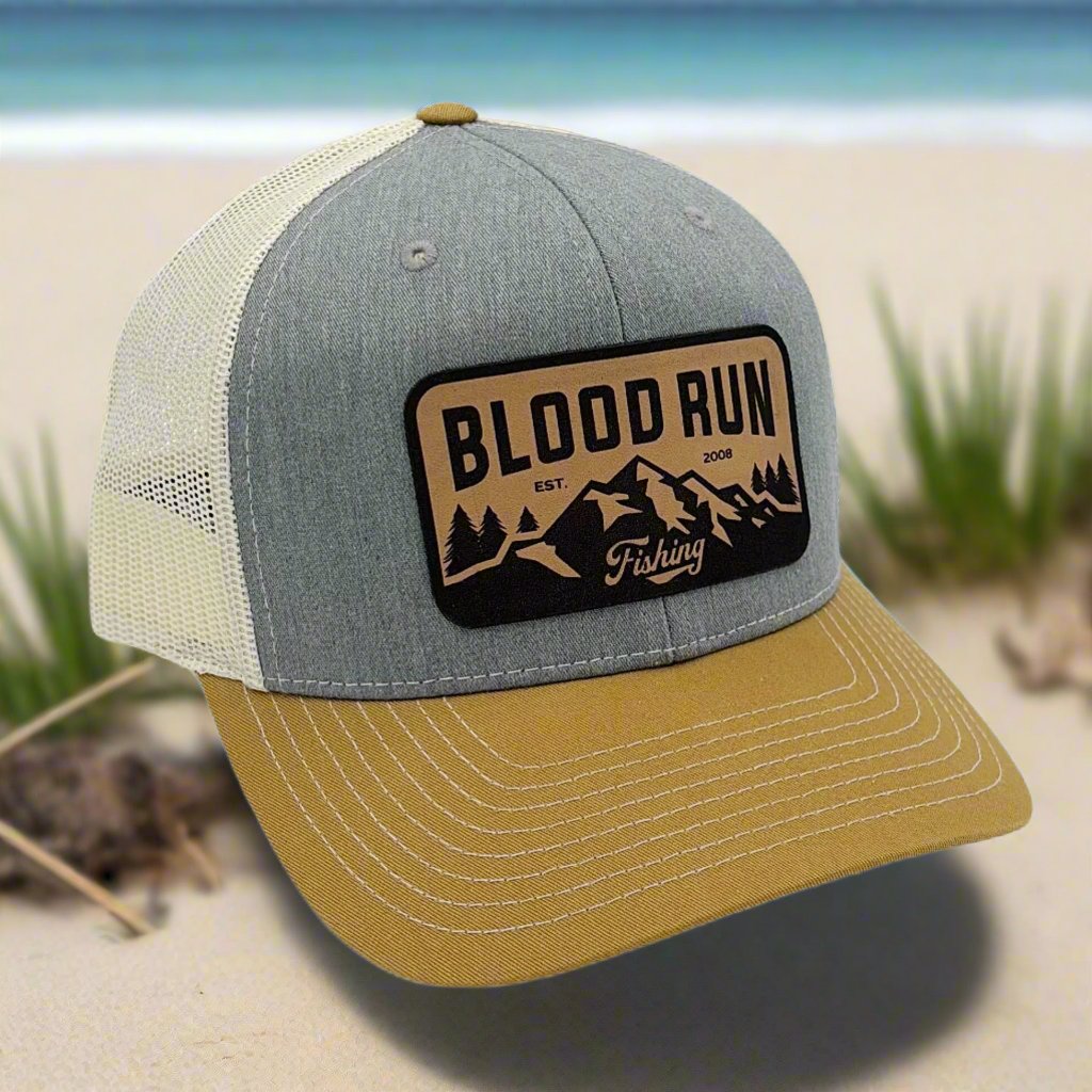Introducing the ultimate fishing accessory for the fashion-savvy angler - the "Captain" Heather Gray space-washed crowned snapback fishing trucker cap with beige mesh, gold crown and leather Blood Run Fishing logo patch. This fishing trucker style baseball hat is not only functional but also stylish, making it the perfect addition to your fishing gear.