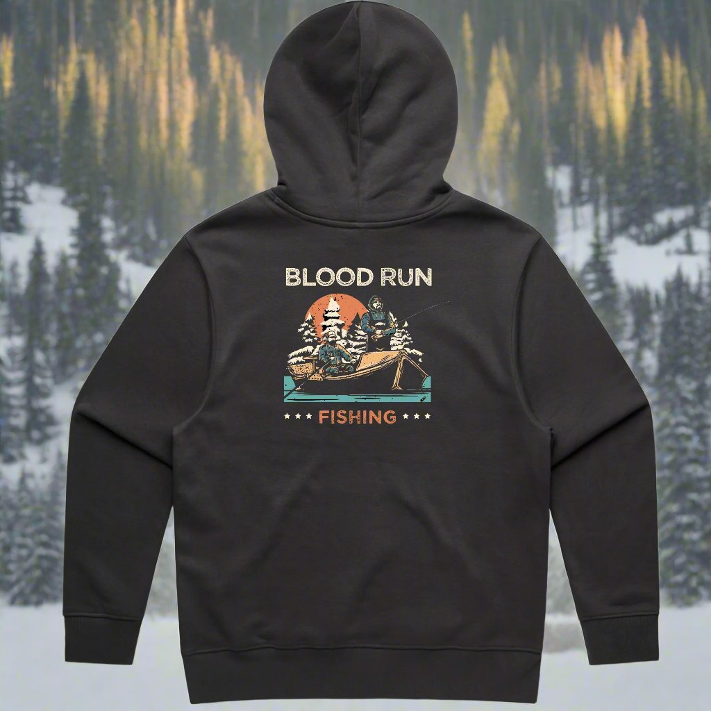 This hoodie is a one of a kind for the guy who likes to drift down through heavy cover.    The large back styled graphic over the Blood Run coal colored dye fabric is an eye catcher, particularly when the guy on the sticks is wearing it.  Features a self-fabric lined hood, oversized to cover your Blood Run fishing hat when the wind is ripping.
