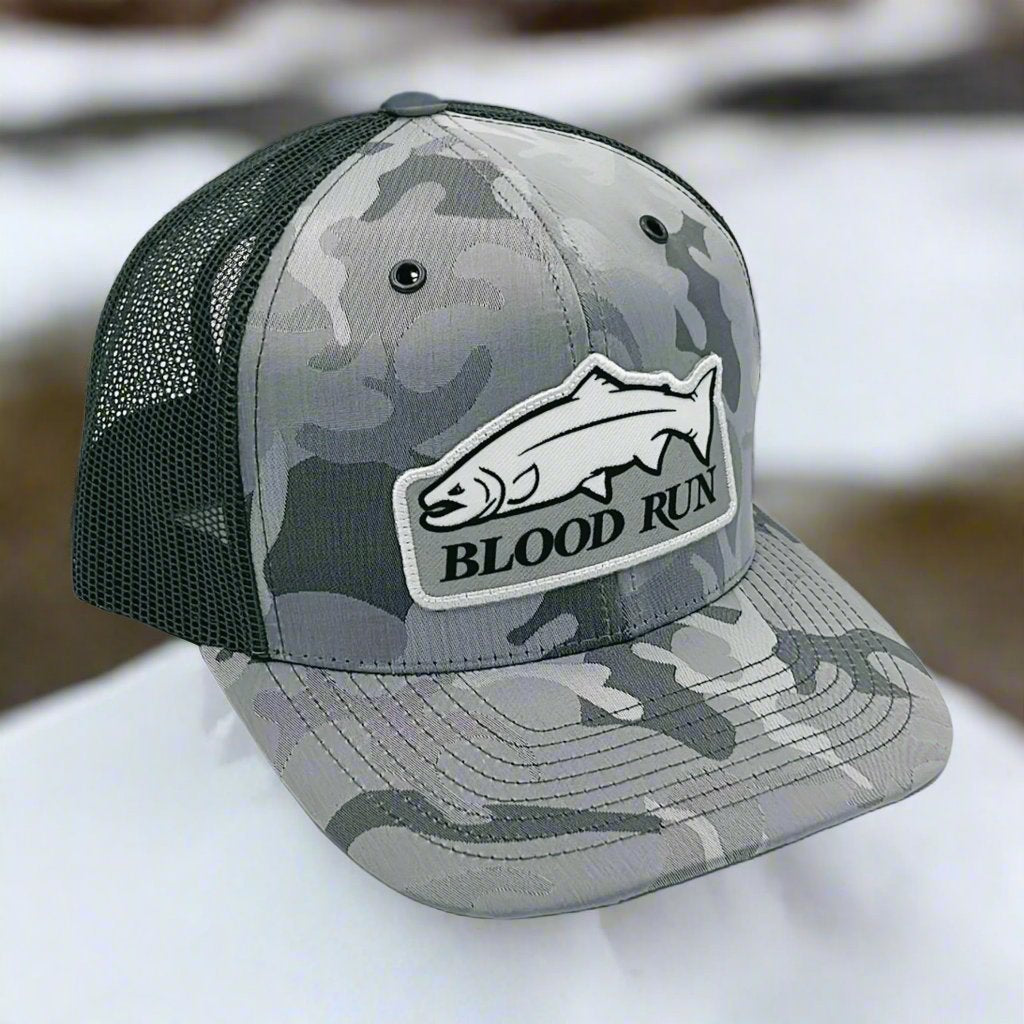 Introducing the Blood Run Fishing Winter Steel chrome grey camouflage fishing hat - the ultimate accessory for any fisherman. Designed with both style and functionality in mind, this cap is a must-have for anyone who loves spending time on the water and making a one of a kind fashion statement.
