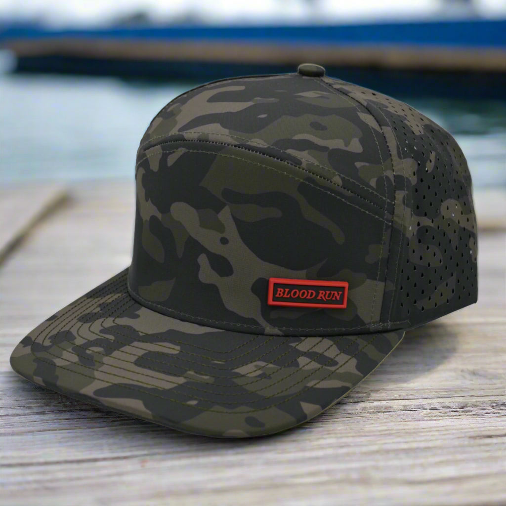 Our Blood Run red 3D embossed logo tricks out this badass olive camo fishing hat.