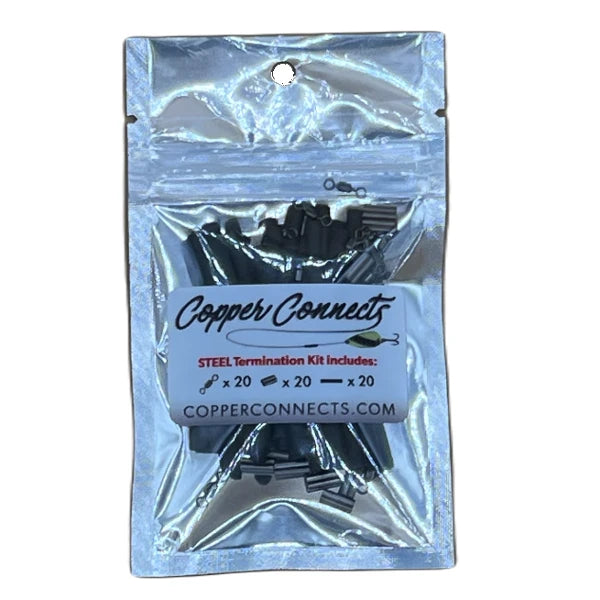 Termination is done by sliding a section of heat shrink and crimp sleeve up the weighted steel fishing line prior to connecting the weighted steel line to the swivel. After the weighted steel fishing line has been run through the swivel, the steel can be run up into the crimp sleeve and then crimped with a pair of wire cutters. The heat shrink can be slid down over the crimp sleeve and secured using a lighter.